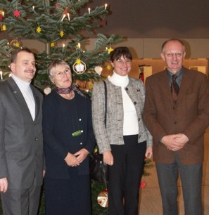 Bürgermeister und stellvertretende Bürgermeisterin von Himmelpfort, Lutz Wilke und Gisela Schröder, Dr. Margrit Wetzel und Lothar Wille, Bürgermeister von Himmelpforten vor dem Weihnachtsbaum der Lebenshilfe. |