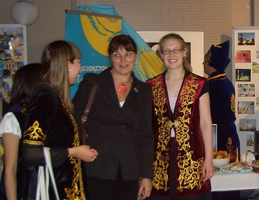 Margrit Wetzel mit Nelli Varkentin in reich bestickter kasachischer Tracht |