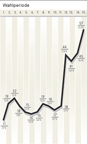 Das war ein weiter Weg. Zu Beginn der ersten Wahlperiode 1949 zählte der Frauenanteil im Parlament gerade einmal 6,8 Prozent; zu Beginn der jüngsten 2002 waren es 32,8 – ein Anstieg um fast 500 Prozent. Und doch handelt es sich eher um eine Momentaufnahme. Der Weg dürfte weitergehen. Zumindest, wenn man die Wählerschaft (1) betrachtet: An der letzten Bundestagswahl beteiligten sich 23,4 Millionen Männer – aber 25,5 Millionen Frauen. Hätte sich dieses Geschlechterverhältnis (2) in der Wahl exakt auch im Parlament widergespiegelt, wären nicht 198 Frauen in den Bundestag gewählt worden, sondern 314.